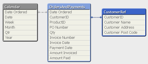 If PO Number was distinct on both tables (one to one relationship) we could join them. On the face of it a good solution although we’d still have two date fields we want to join to a single calendar table (I’ve written a post on the types of joins you can use here). We would now need a link table to bridge the gap.