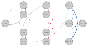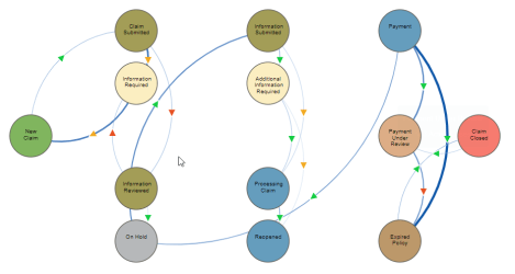 Chord diagram was difficult to analysis so the decision was made to use the Network Chart as the starting point although I needed to do more with it, I wanted the process to flow left to right from the open to closed action with all the work nodes in the middle. Off the shelf network charts used force to determine where a node would be positioned, this would be random and as such you couldn’t see the left to right flow as you were always looking for those start end end point. For this to work I decided to create a bespoke extension using D3.